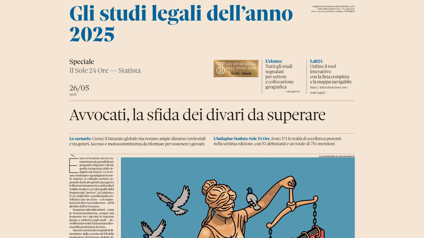 Lo Studio Legale Carrozza Pignatelli ha ricevuto il riconoscimento di “Studio legale dell’anno”, categoria “Migliori studi del centro Italia”, assegnato da Il Sole 24 Ore per la per gli anni 2021, 2022, 2023, 2024 e 2025.